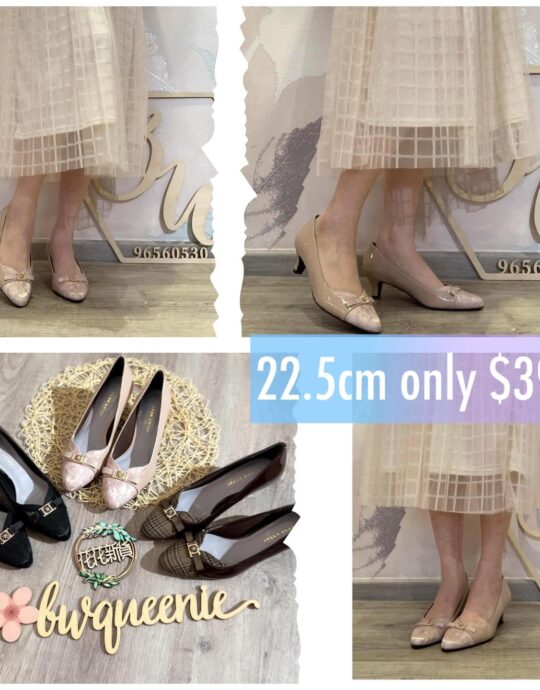 快💨閃 吸引價♥️$399 🇯🇵 新品 Jelly Beans 5cm高跟👠鞋 204-22924 金色方通花扣小立體蝴蝶結🎀 漆皮併lace布料特別 內裡全包棉布 非常好著 粉紅/黑/啡色格仔 3色入